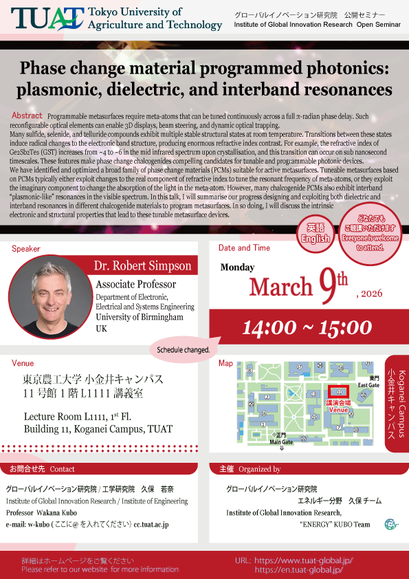 | 講演タイトル | "Phase change material programmed photonics: plasmonic, dielectric, and interband resonances" <要旨> Programmable metasurfaces require meta-atoms that can be tuned continuously across a full π-radian phase delay. Such reconfigurable optical elements can enable 3D displays, beam steering, and dynamic optical trapping. Many sulfide, selenide, and telluride compounds exhibit multiple stable structural states at room temperature. Transitions between these states induce radical changes to the electronic band structure, producing enormous refractive index contrast. For example, the refractive index of Ge₂Sb₂Te₅ (GST) increases from ~4 to ~6 in the mid infrared spectrum upon crystallisation, and this transition can occur on sub nanosecond timescales. These features make phase change chalcogenides compelling candidates for tunable and programmable photonic devices. We have identified and optimized a broad family of phase change materials (PCMs) suitable for active metasurfaces. Tuneable metasurfaces based on PCMs typically either exploit changes to the real component of refractive index to tune the resonant frequency of meta-atoms, or they exploit the imaginary component to change the absorption of the light in the meta-atom. However, many chalcogenide PCMs also exhibit interband “plasmonic-like” resonances in the visible spectrum. In this talk, I will summarise our progress designing and exploiting both dielectric and interband resonances in different chalcogenide materials to program metasurfaces. In so doing, I will discuss the intrinsic electronic and structural properties that lead to these tunable metasurface devices. |