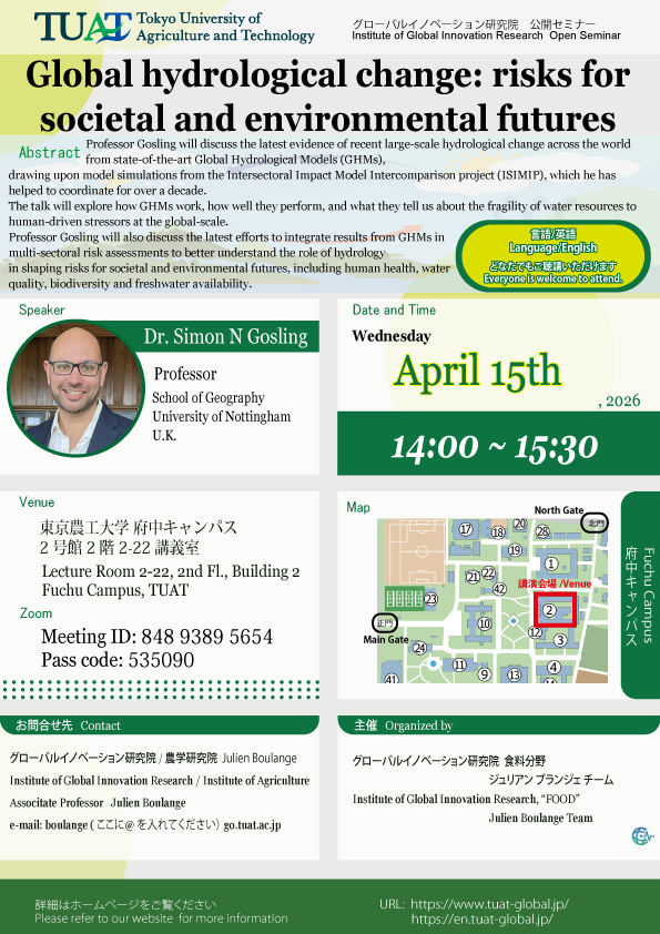 | 講演タイトル | "Global hydrological change: risks for societal and environmental futures" <要旨> Professor Gosling will discuss the latest evidence of recent large-scale hydrological change across the world from state-of-the-art Global Hydrological Models (GHMs), drawing upon model simulations from the Intersectoral Impact Model Intercomparison project (ISIMIP), which he has helped to coordinate for over a decade. The talk will explore how GHMs work, how well they perform, and what they tell us about the fragility of water resources to human-driven stressors at the global-scale. Professor Gosling will also discuss the latest efforts to integrate results from GHMs in multi-sectoral risk assessments to better understand the role of hydrology in shaping risks for societal and environmental futures, including human health, water quality, biodiversity and freshwater availability. |