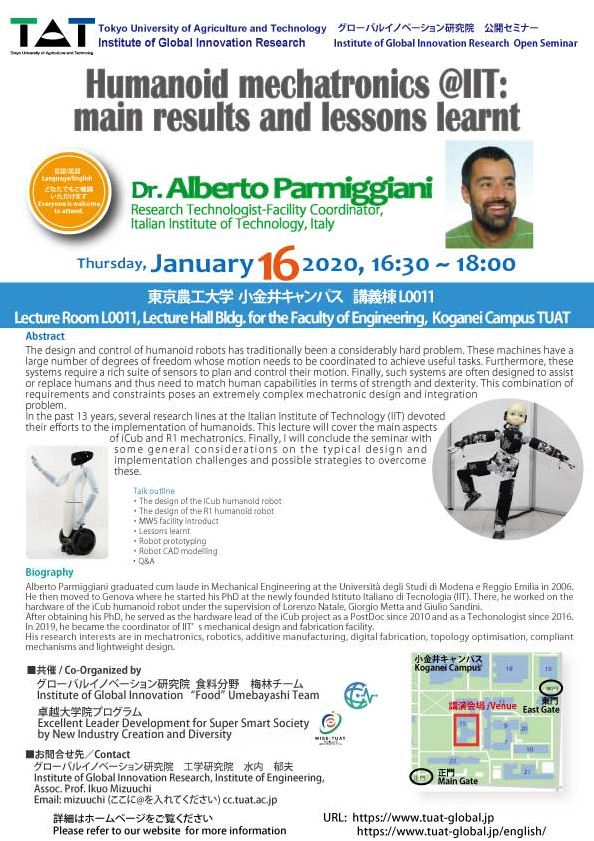 | 講演タイトル | ◆Alberto Parmiggiani (Research Technologist-Facility Coordinator, Italian Institute of Technology, Italy) "Humanoid mechatronics @IIT: main results and lessons learnt" <要旨> The design and control of humanoid robots has traditionally been a considerably hard problem. These machines have a large number of degrees of freedom whose motion needs to be coordinated to achieve useful tasks. Furthermore, these systems require a rich suite of sensors to plan and control their motion. Finally, such systems are often designed to assist or replace humans and thus need to match human capabilities in terms of strength and dexterity. This combination of requirements and constraints poses an extremely complex mechatronic design and integration problem. In the past 13 years, several research lines at the Italian Institute of Technology (IIT) devoted their efforts to the implementation of humanoids. This lecture will cover the main aspects of iCub and R1 mechatronics. Finally, I will conclude the seminar with some general considerations on the typical design and implementation challenges and possible strategies to overcome these. <アウトライン> ・The design of the iCub humanoid robot ・The design of the R1 humanoid robot ・MWS facility introduction ・Lessons learnt ・Robot prototyping ・Robot CAD modelling ・Q&A <略歴> Alberto Parmiggiani graduated cum laude in Mechanical Engineering at the Università degli Studi di Modena e Reggio Emilia in 2006. He then moved to Genova where he started his PhD at the newly founded Istituto Italiano di Tecnologia (IIT). There, he worked on the hardware of the iCub humanoid robot under the supervision of Lorenzo Natale, Giorgio Metta and Giulio Sandini. After obtaining his PhD, he served as the hardware lead of the iCub project as a PostDoc since 2010 and as a Techonologist since 2016. In 2019, he became the coordinator of IIT’s mechanical design and fabrication facility. His research interests are in mechatronics, robotics, additive manufacturing, digital fabrication, topology optimisation, compliant mechanisms and lightweight design. |