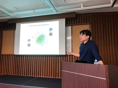 地球温暖化が顕著に進む今日において、温室効果ガスの削減が必要不可欠になっている。排水処理施設より排出される温室効果ガスは、二酸化炭素・メタンに加え、窒素化合物の亜酸化窒素(N2O)が挙げられる。N2Oの排出総量は二酸化炭素・メタンに比べて非常に少ないものの、温室効果が二酸化炭素の約300倍であることから、21世紀に入り排出量の削減が強く求められている。KAISTのYoon博士は、N2Oを消費する細菌の探索、生理学的特性評価において世界的に認知された新進気鋭の研究者である。講演内容として、特に効率的にN2Oの削減が可能とされているGemmatimonas auranticaの生理生態に関する最新データが提供された。また、この細菌が自然界で生存する意義について、土壌中表層の酸化還元電位と存在量に関する示唆に富んだ考察を例に挙げて説明された。さらに、排水処理施設からN2Oを削減する試みとして独自技術のバイオフィルターを開発しており、パイロットスケールにおけるN2O削減性能の評価について紹介された。このバイオフィルターが優れたN2O削減性能を示しただけでなく、論文では示せない失敗データも惜しみなく紹介され、考案した技術の実用化は、必ずしもまっすぐ研究が進むわけでなく、多くの困難が伴うことを語っていただいた。