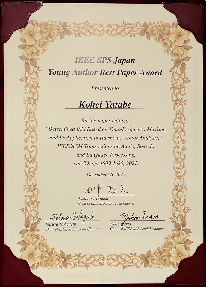 ローバルイノベーション研究院の矢田部浩平准教授が、2026年3月3日「IEEE SPS Japan Young Author Best Paper Award」を受賞しました。